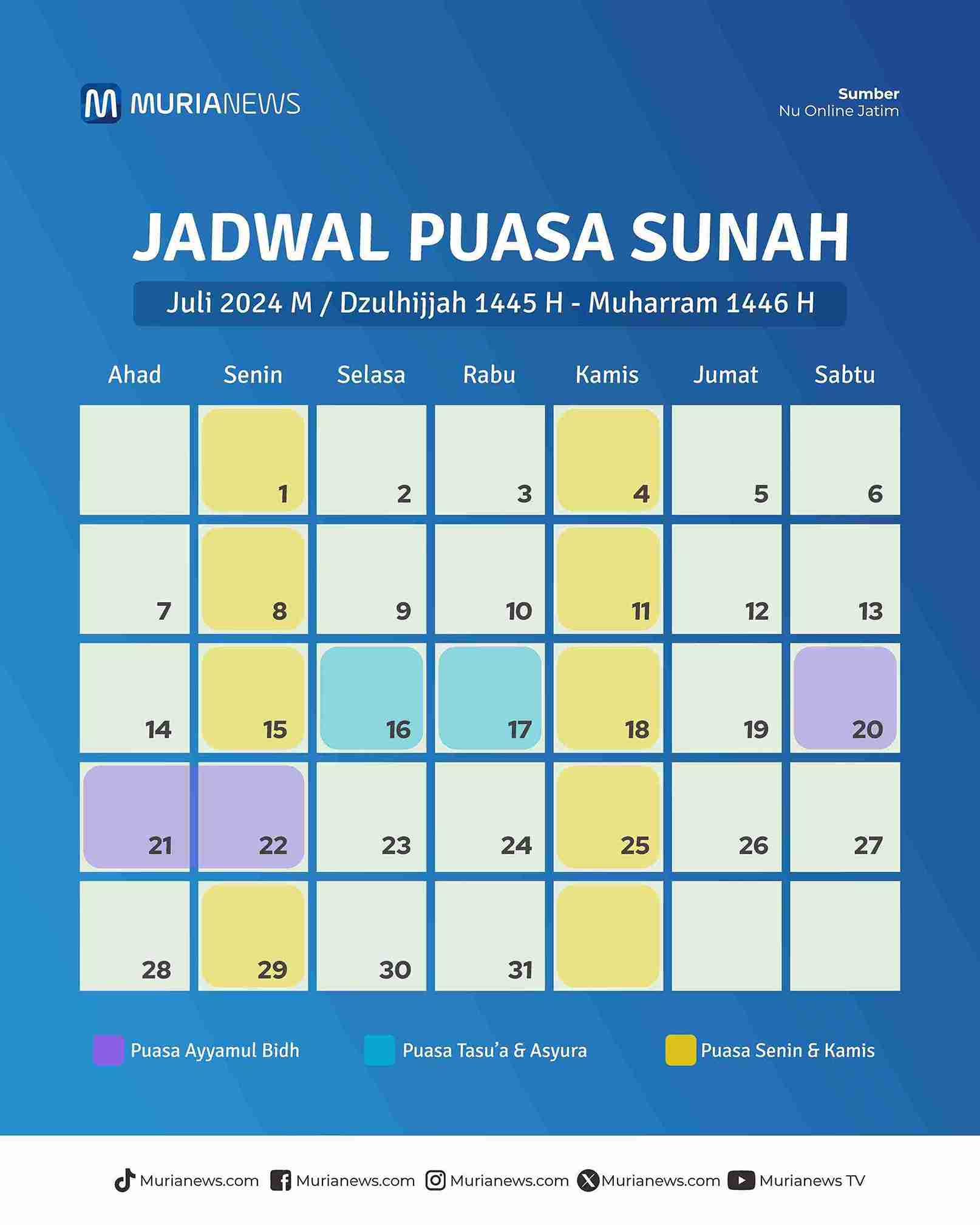 Berikut jadwal puasa sunah di bulan Muharam: